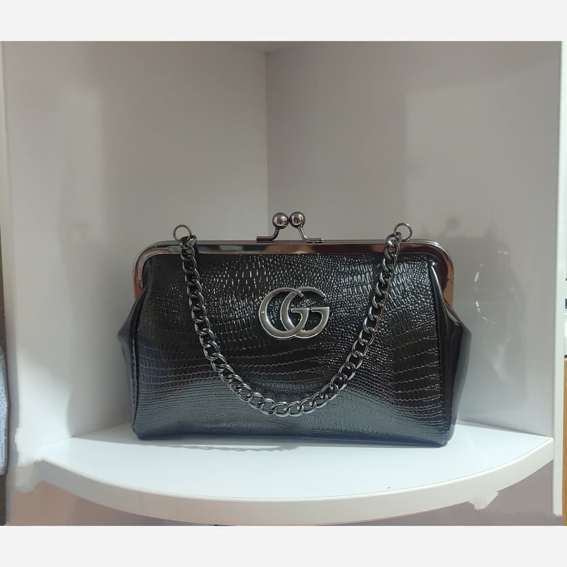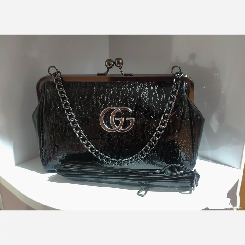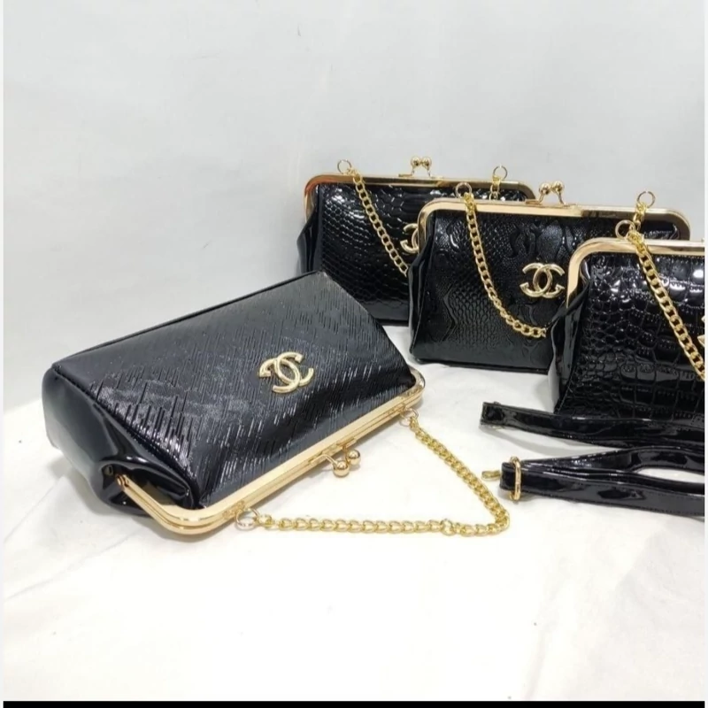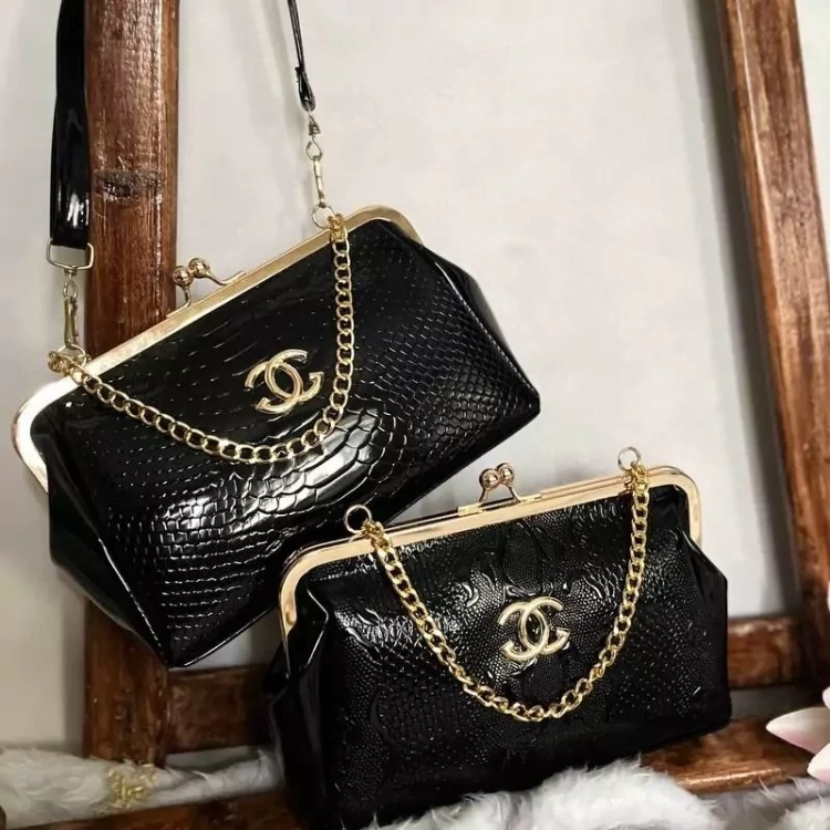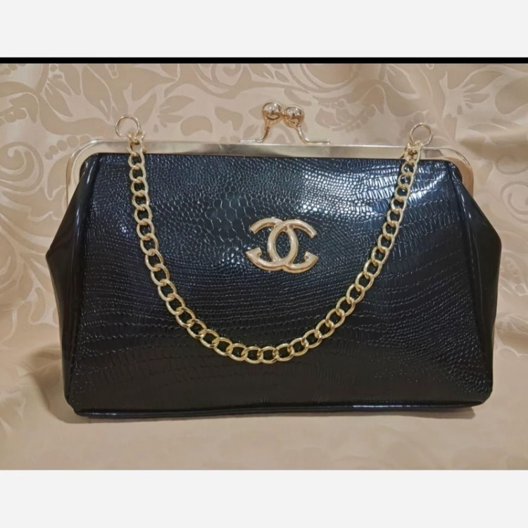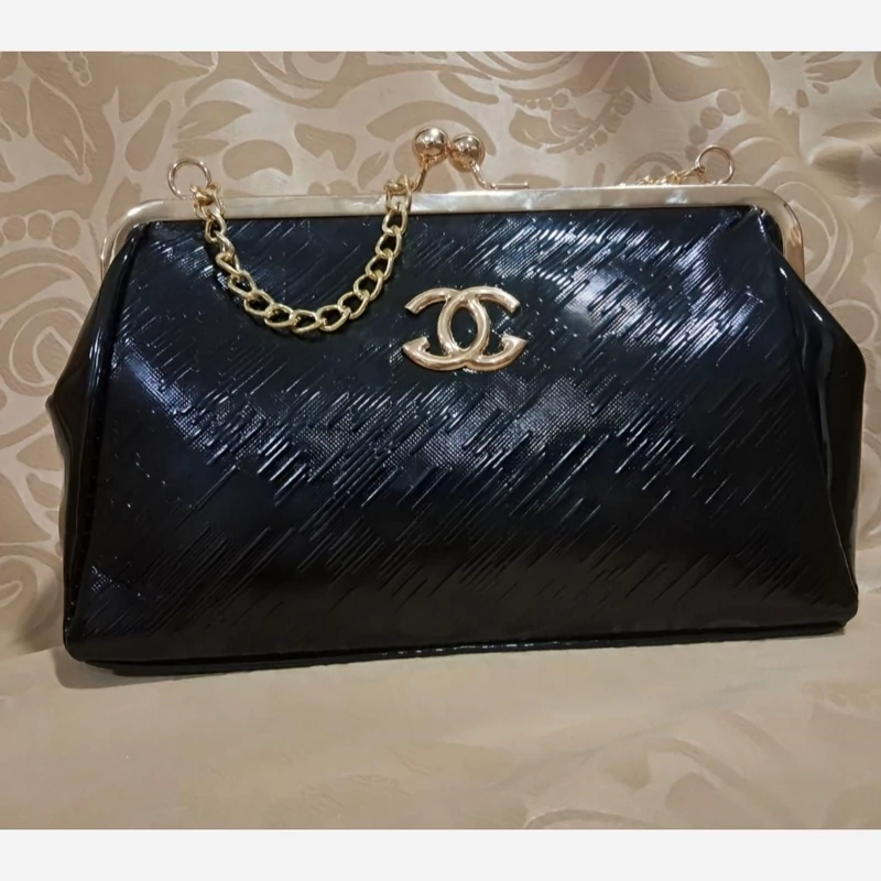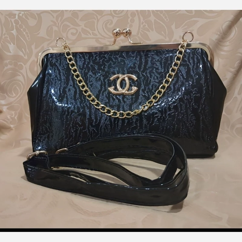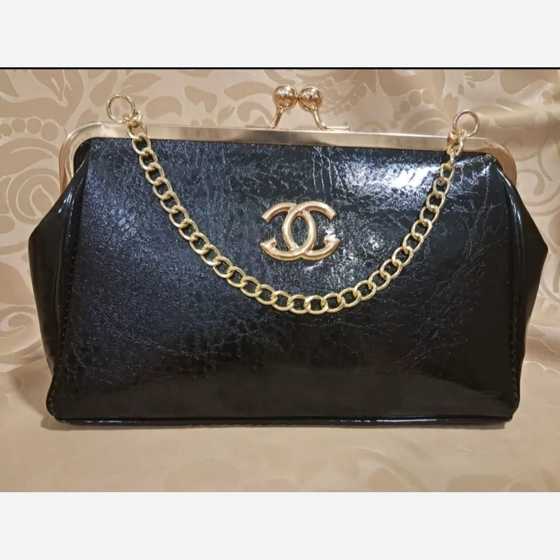 رنگ: مشکی جنس: براق (ورنی یا چرم مصنوعی براق) طرح: دارای طرح برجسته (طرح شنل) روی سطح کیف قفل: قفل فلزی طلایی رنگ و نقره ای با دو گوی در بالا بند/زنجیر: دارای زنجیر فلزی طلایی و نقره ای رنگ کوتاه آرم/لوگو: دارای لوگوی طلایی و نقره ای رنگ (شبیه لوگوی شنل) در قسمت جلوی کیف